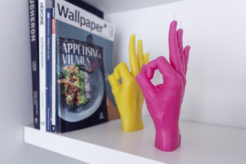 Eine gelbe und eine pinke Candlehand-Kerze, die das OK-Zeichen zeigen. Sie st ... mehr