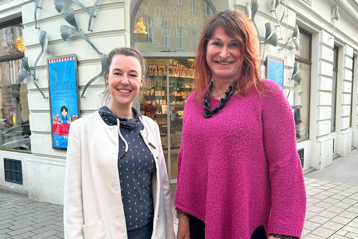 Valerie Lenk hat Apothekerin Ines Werzinger (links im Bild) im Interview spannende Einblicke in die Arbeit des Vereins TransX, die Herausforderungen für Trans*Personen in Österreich und besorgniserregende politische Entwicklungen gegeben.