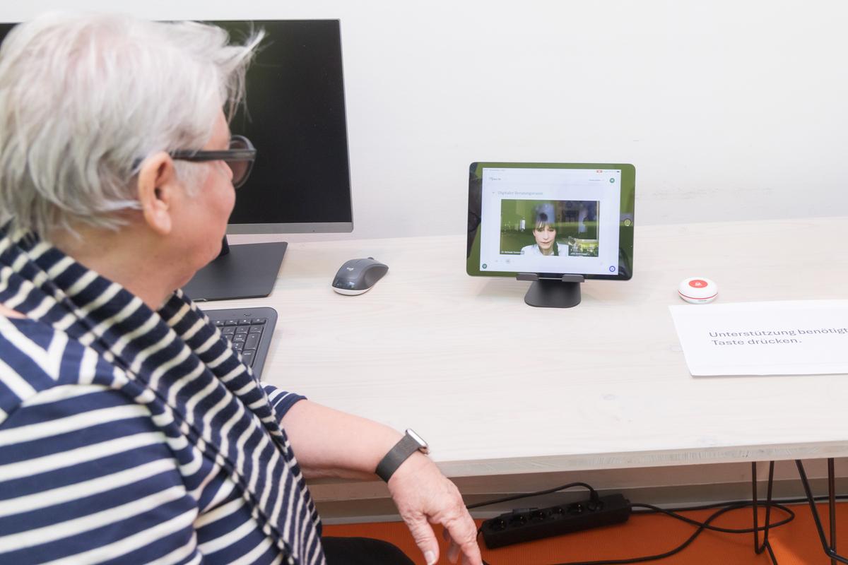 Wenn Kund*innen bei Bedarf rasch ein eRezept benötigen oder ein gesundheitliches Problem abgeklärt werden muss, können sie bei uns direkt in der Apotheke ein Online-Gespräch mit einem Arzt oder einer Ärztin führen. Unsere Apotheker*innen begleiten durch den Prozess, sind beim Gespräch selbst aber natürlich nicht anwesend - das erfolgt vertraulich in unserem Beratungsraum.